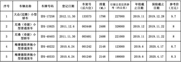 吉林省天池拍賣有限責任公司受長白山旅游股份有限公司的委托,對以下5臺公務(wù)用車進行公開拍賣: